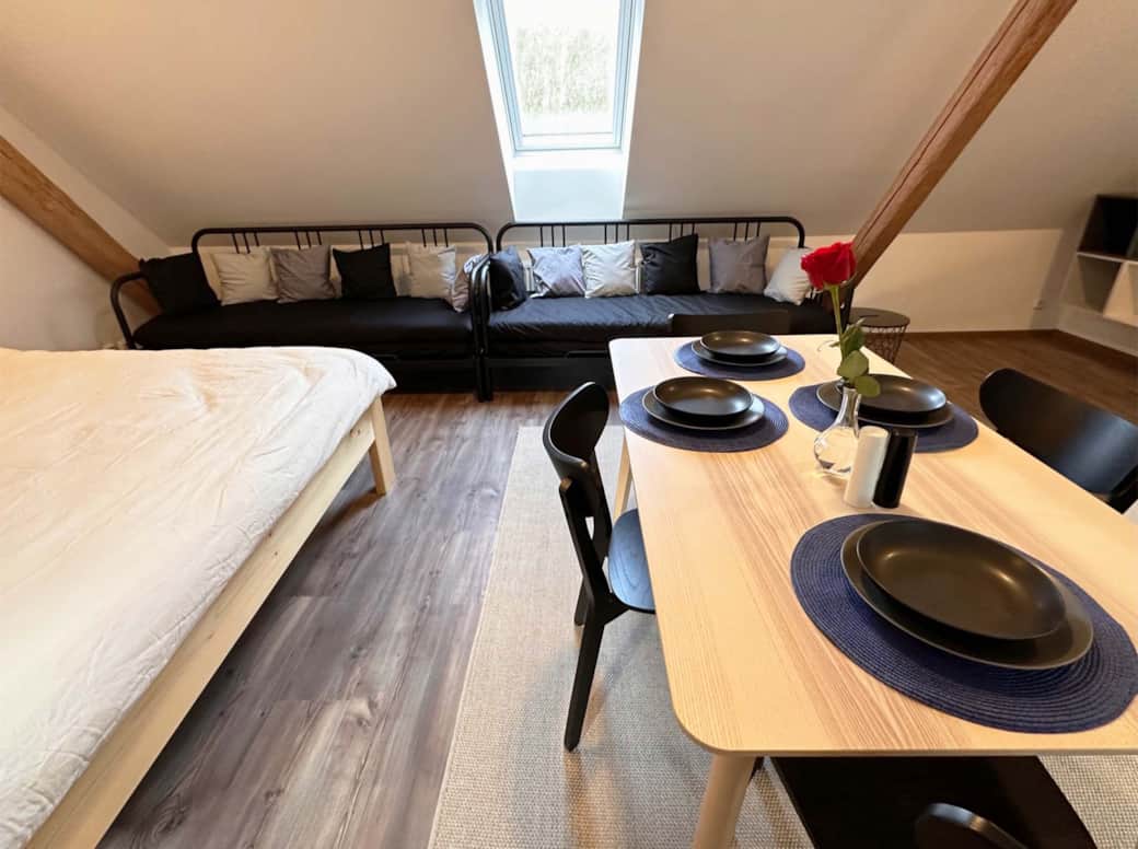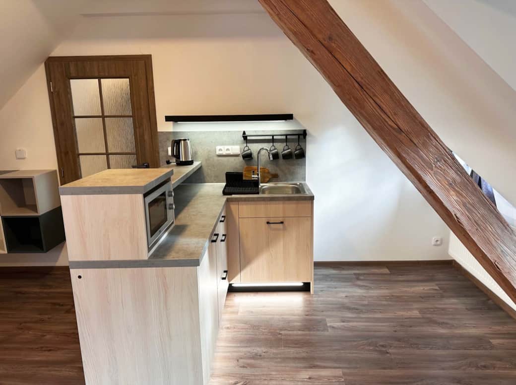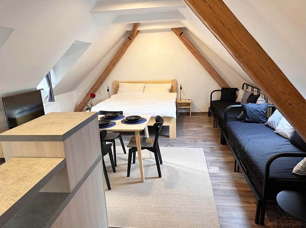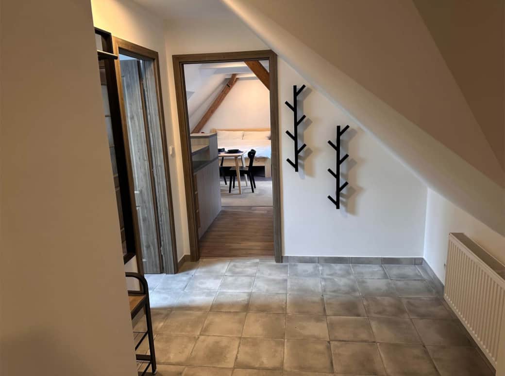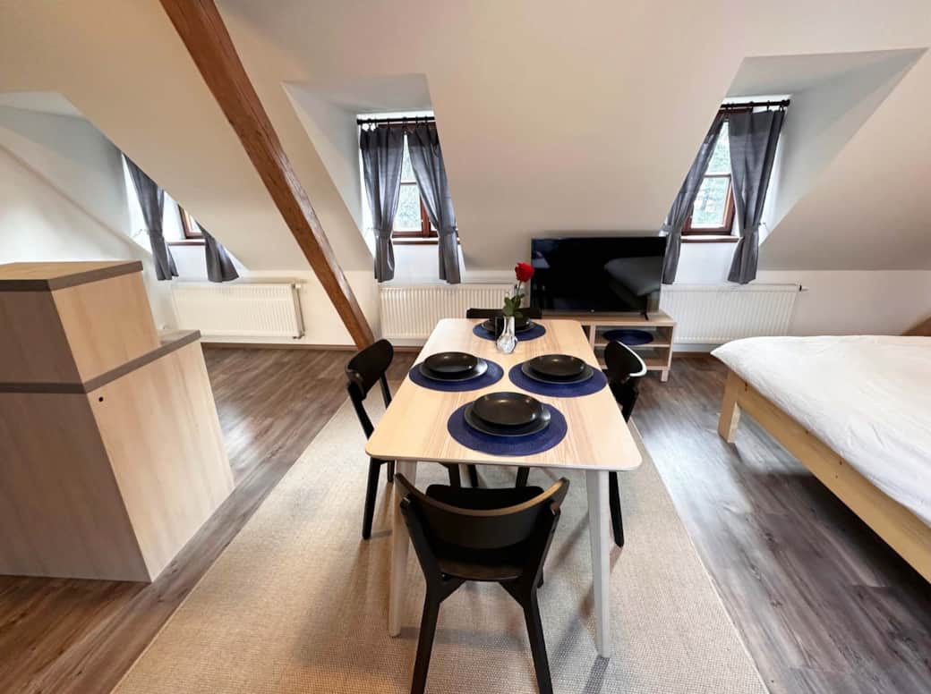 Mlynář Jelínek nabízí 50 m² místnost s výhledem do zahrady a koupelnu se sprchou a toaletou. Apartmán má dobře vybavenou kuchyňku, jídelní stůl a rozkládací pohovku. Pro zábavu máme TV s 42“ obrazovkou, bezplatnou Wi-Fi, různé hry a karty. Renovovaná dřevěná okna a trámy dodávají apartmánu kouzlo. Manželská postel z masivního dřeva, hypoalergenní přikrývky a polštáře, povlečení z bio bavlny, úložné prostory. Pro děti do tří let postýlka s přebalovacím pultem a hračkami.
