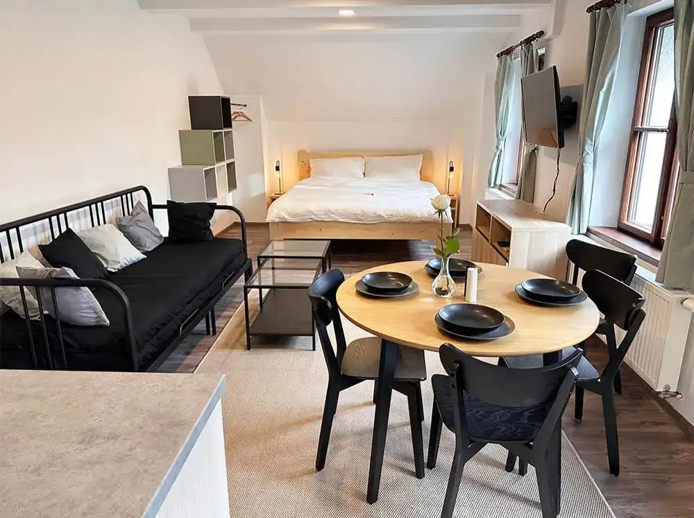 Apartment Mlynář Humpolecký, 36 m², with a view of the garden, offers comfortable accommodation in one room with a corridor, a toilet and a bathroom with a shower. There is an equipped kitchenette, dining table, sofa bed, Wi-Fi and Internet TV. A double bed made of solid wood with hypoallergenic blankets and storage spaces ensure comfort. Towels, hairdryer, toiletries, cot and toys are available. The apartment is named after the miller Humpolecký from the 17th century.